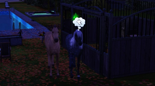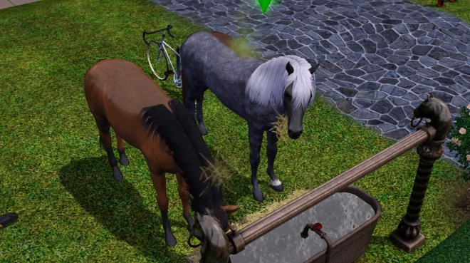 I’m really missing my sheet on who-is-who, now. The dark brown horse doesn’t matter — she was a captain asshole, worse than Jezebel, so she was given back. The blue horse is… Cobalt, maybe? Some C name, I think.