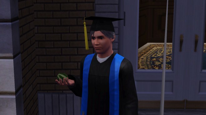So Gabriel graduates with honours or whatever, and celebrates by eating the tiniest watermelon in the world.