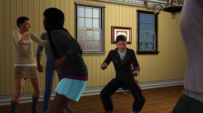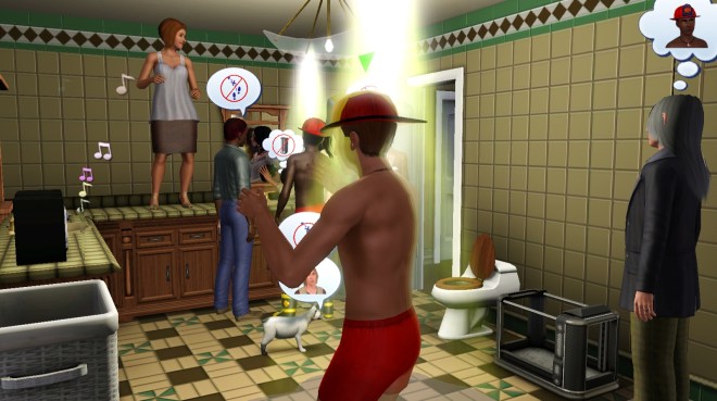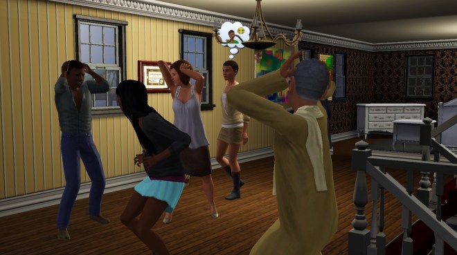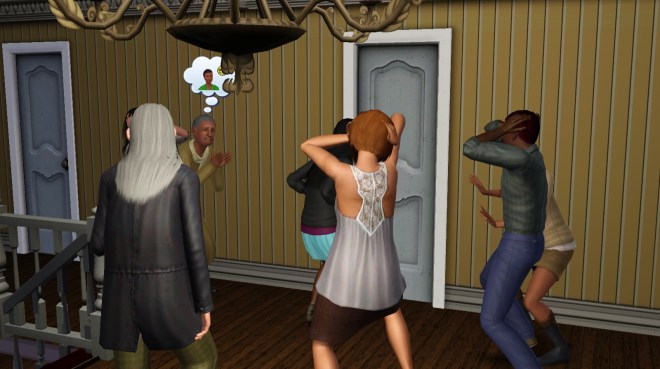 Well, everyone else is kind of stuck in the bathroom, with the dancers. Awkward.