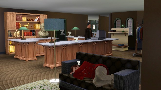 Meanwhile, I sent Charles down to the Consignment Store to sell some items, only to find him passed out on the couch instead. Dude, wake up! I didn’t send you here to take a nap!