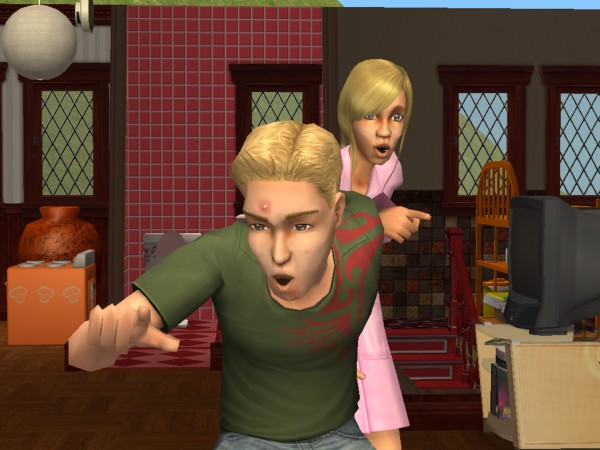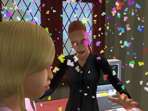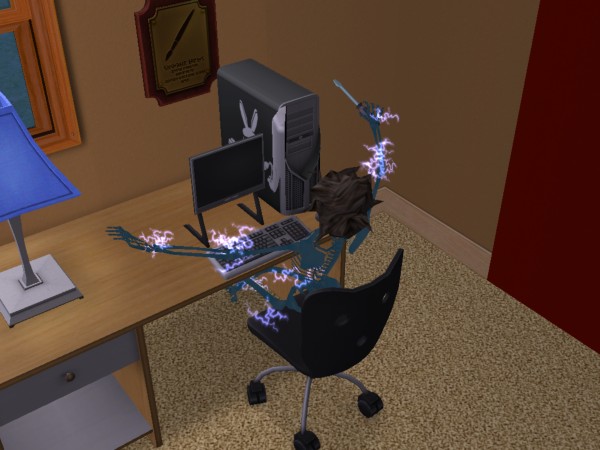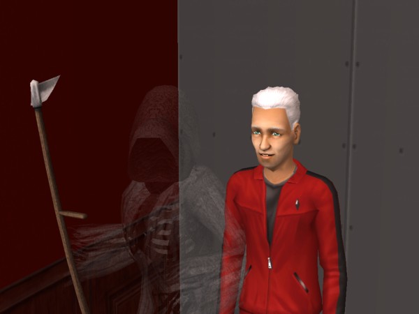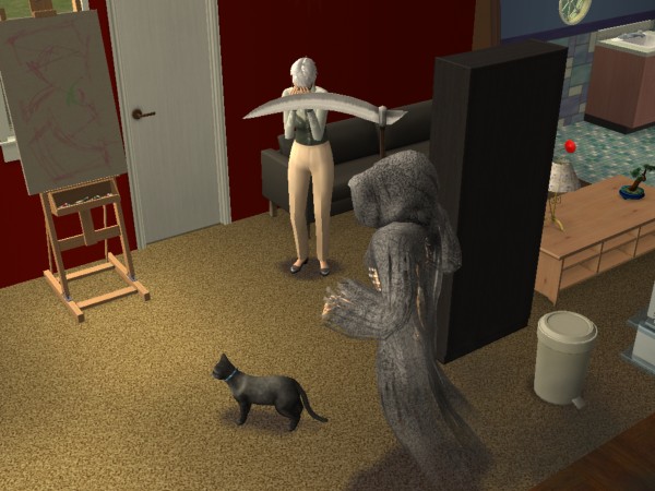 So I try to get nice death photos, but when my Sims die they lose half of their freakin’ body, and then the Hula Girl smashed herself straight through Grim, and well, this is the result. Rest in peace, Antony. YOu helped get our population up and gave us a solid business. You earned that platinum death.