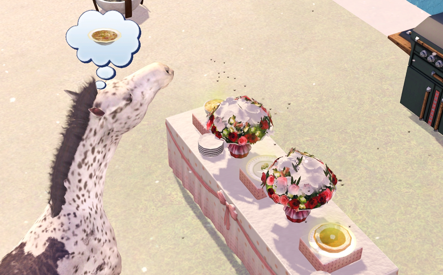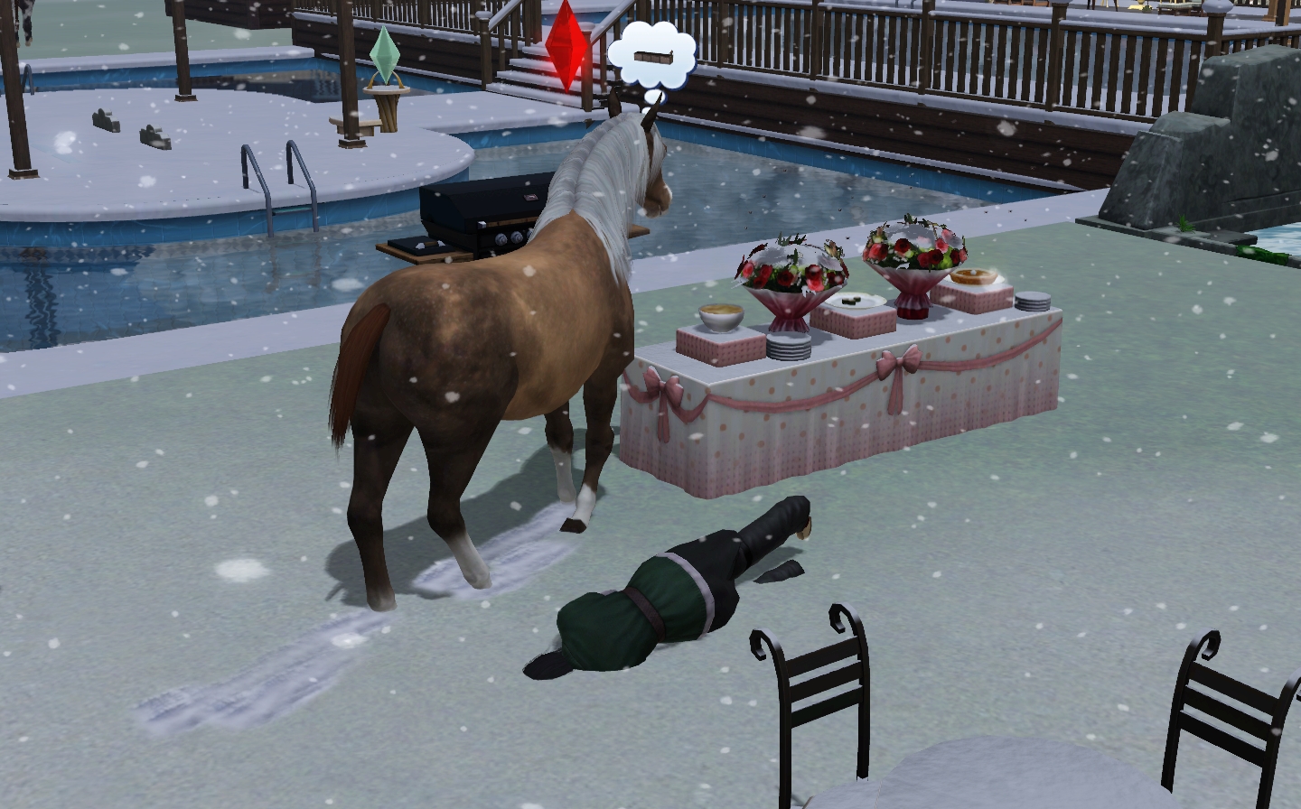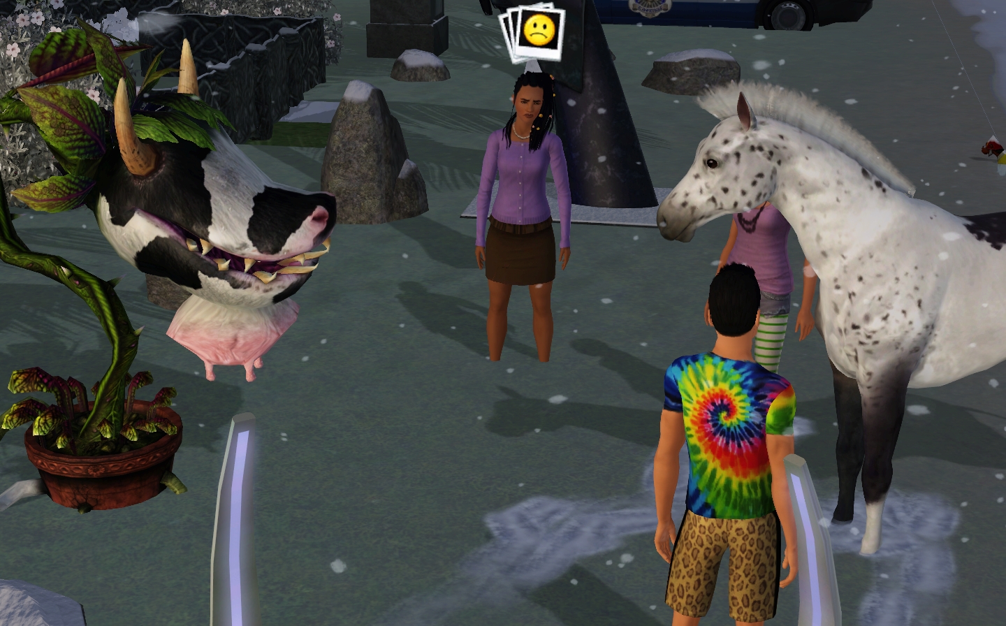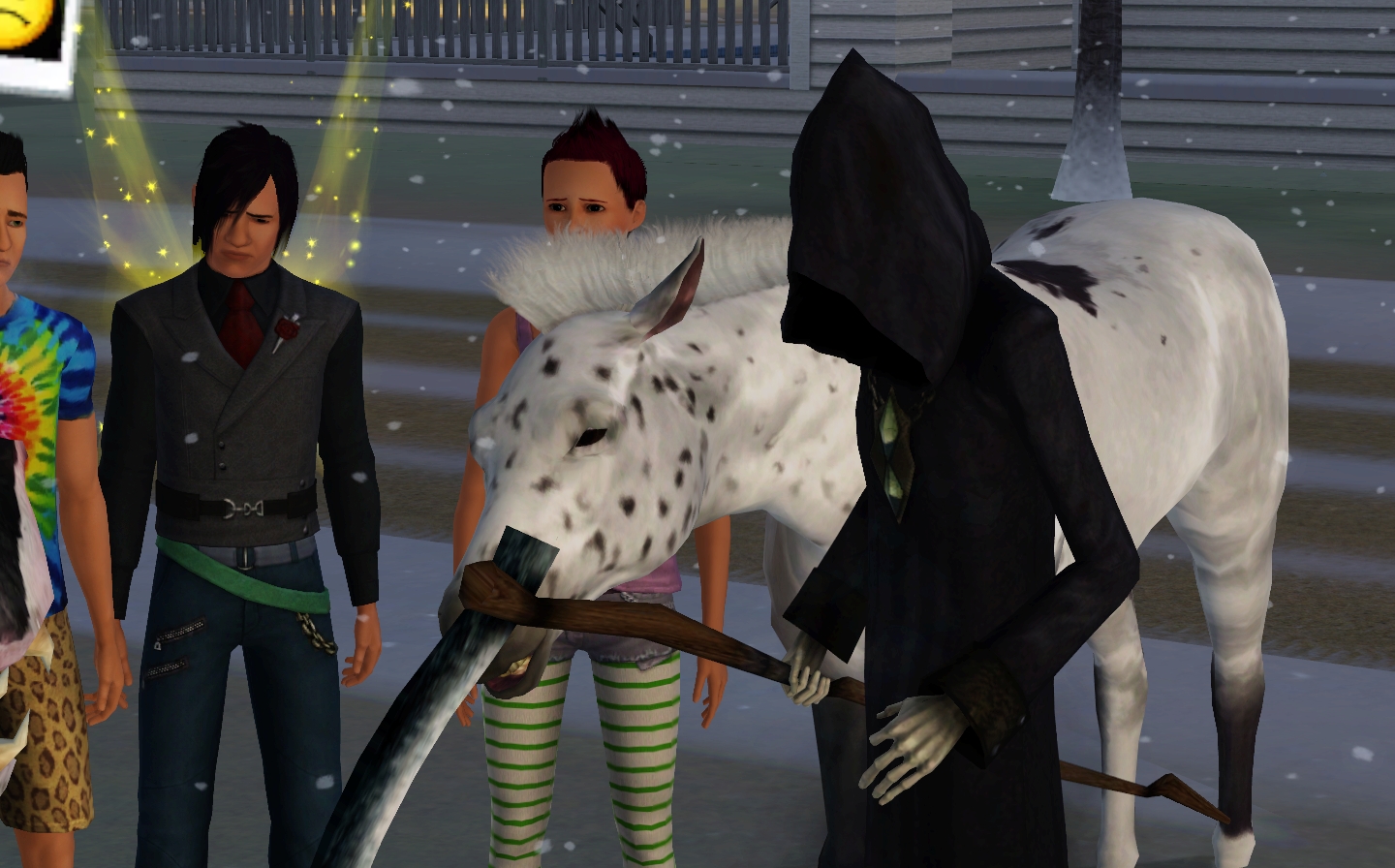 “You know, we really ought to be used to this by now.”“Yessss, yessss, it worked, Daddy!” “MWAHAHAHA!” “MWAHAHAHA!”“Excuse me, horse, this is not a salt lick!” “Mmmmm, dried ectoplasm!”I went digging through my Sim’s memories and I think that this is Leleani, one of Bex’s kids. Sorry, Bex.“Well I guess that cowplant taught me, eh, Grim? Daddy’s not going to be impressed with me.”“I’m telling you, this place is monstrous! They ignore their kids, serve rotten food, and they just killed someone! Definitely the go-to haunted house next year– oh shit, I think they heard me!”So I’m fairly certain that we have two parties going on in these photos. That or we combined two birthdays and Christmas into a neverending night.Okay, on second thought, maybe it IS one long party.