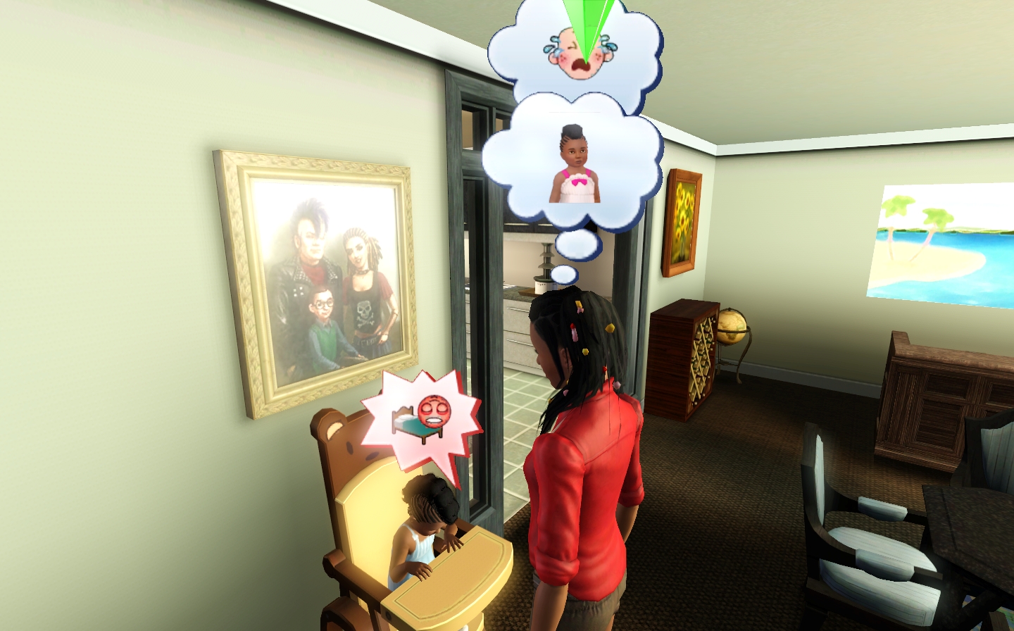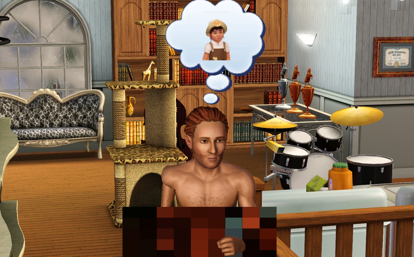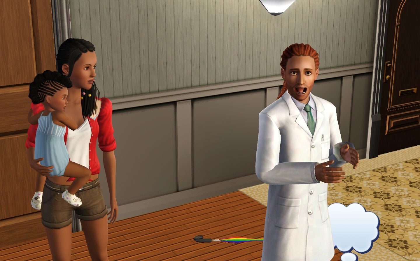 I don’t care if the mandate came from Will Wright himself, no walking around naked with the kids in your thought bubble!Thankfully, Anna is safe from her crazy family, though not from choking hazards.