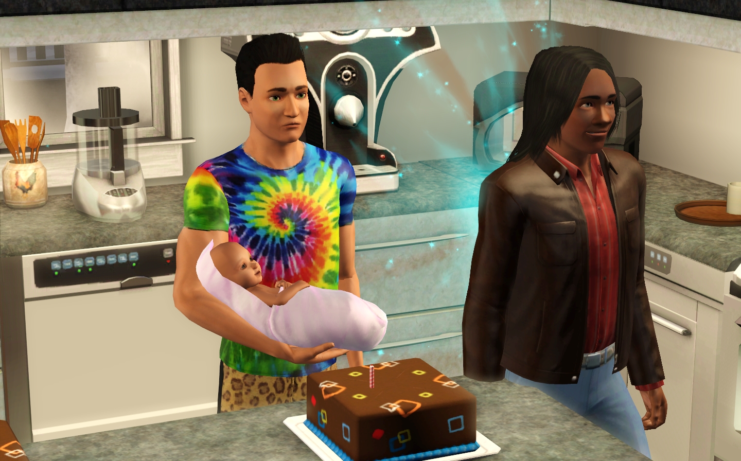 “Yes, a bomb could fit in the rafters there…”The family is thrilled about the twins’ birthday. No synchronized birthdays here, since that requires basic cooperation from my Sims.Bruce, stop flirting with the guests. This is a kid’s birthday party!