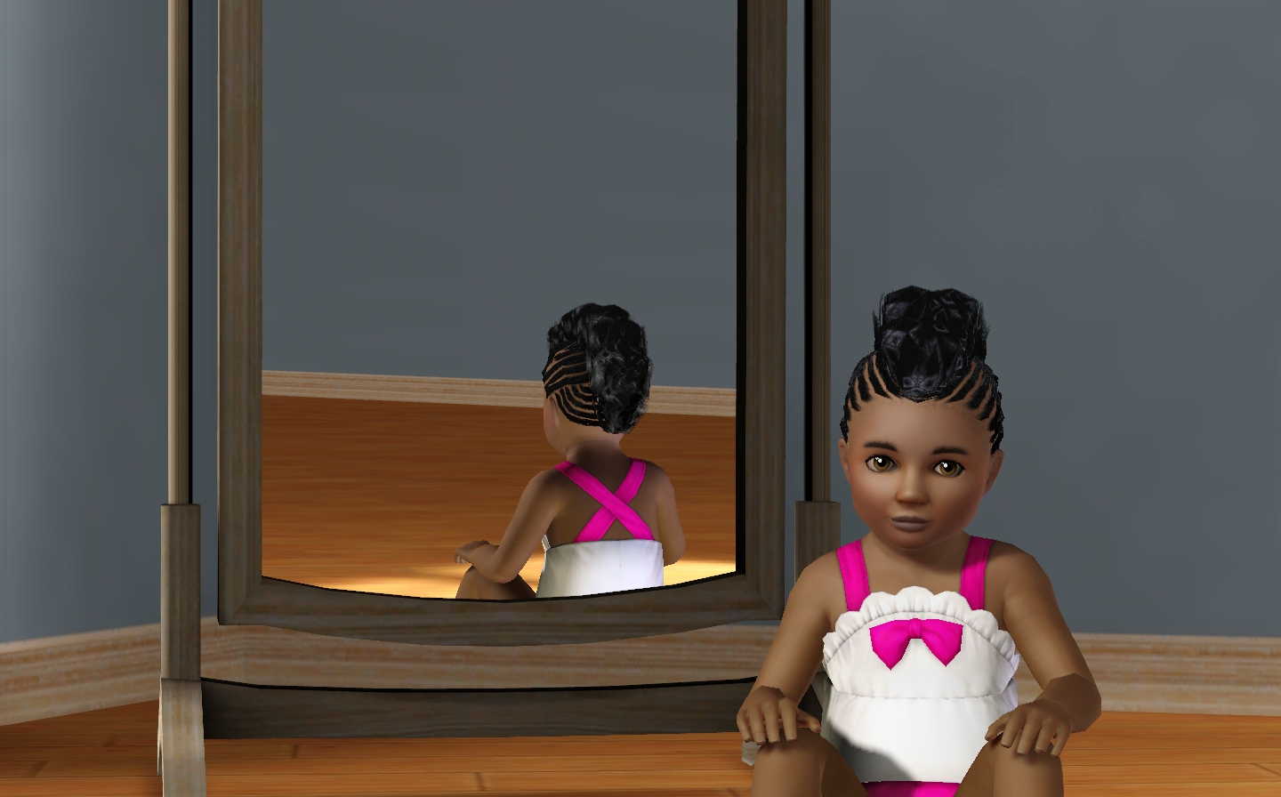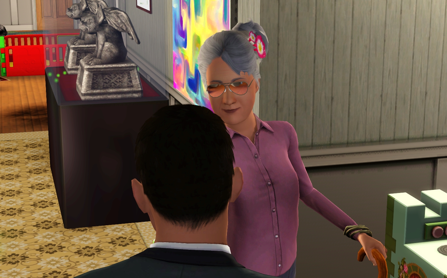 Yeah, Mary Sue grew old rather fabulously.I don’t typically redress Sims, but I think I did for these two. Here’s Christine…And here’s Anna sporting way more awesome hair.But of course, the kids were already forgotten by my family and the Meadow Thayer lookalike over there.