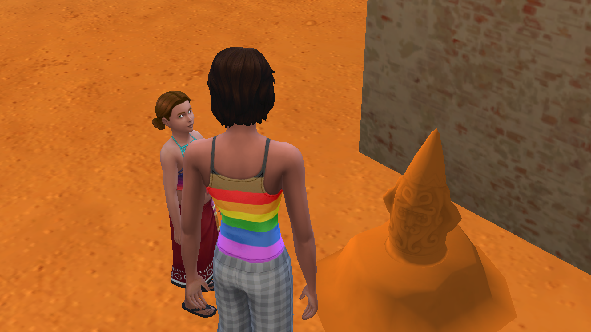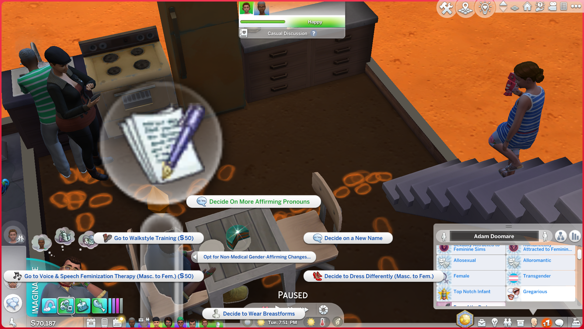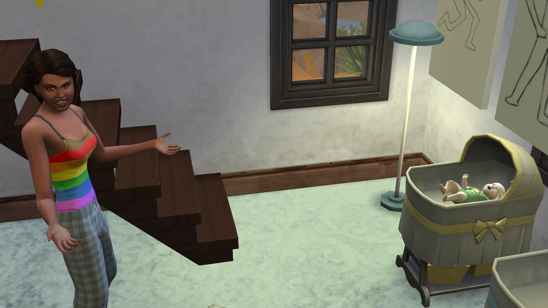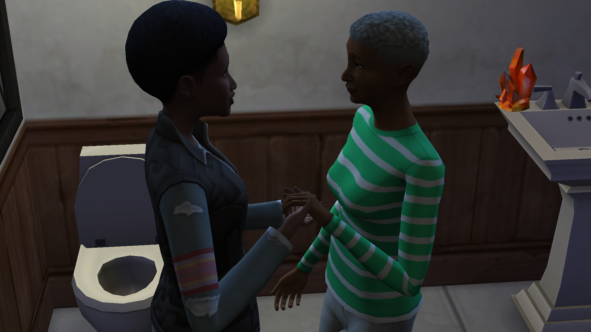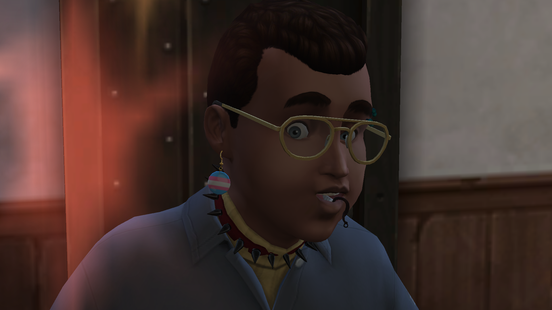 And she grew up with transgender earrings intact. That’s the point at which I went okay, girl, I get the hint. I have a mod that allows you to randomize gender and orientation, or select it yourself, and it’s designed to work with/expand upon EA’s half-assed system. It even has stuff like surgery and voice therapy, but since we haven’t unlocked Journalist yet, I figured we couldn’t go there yet.