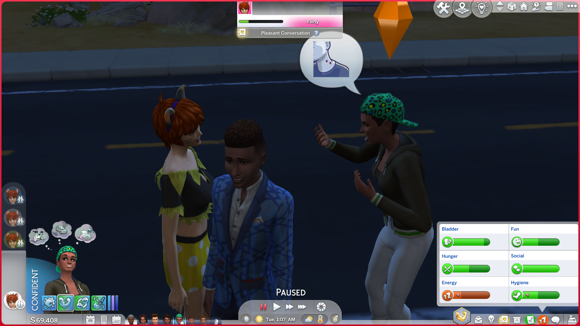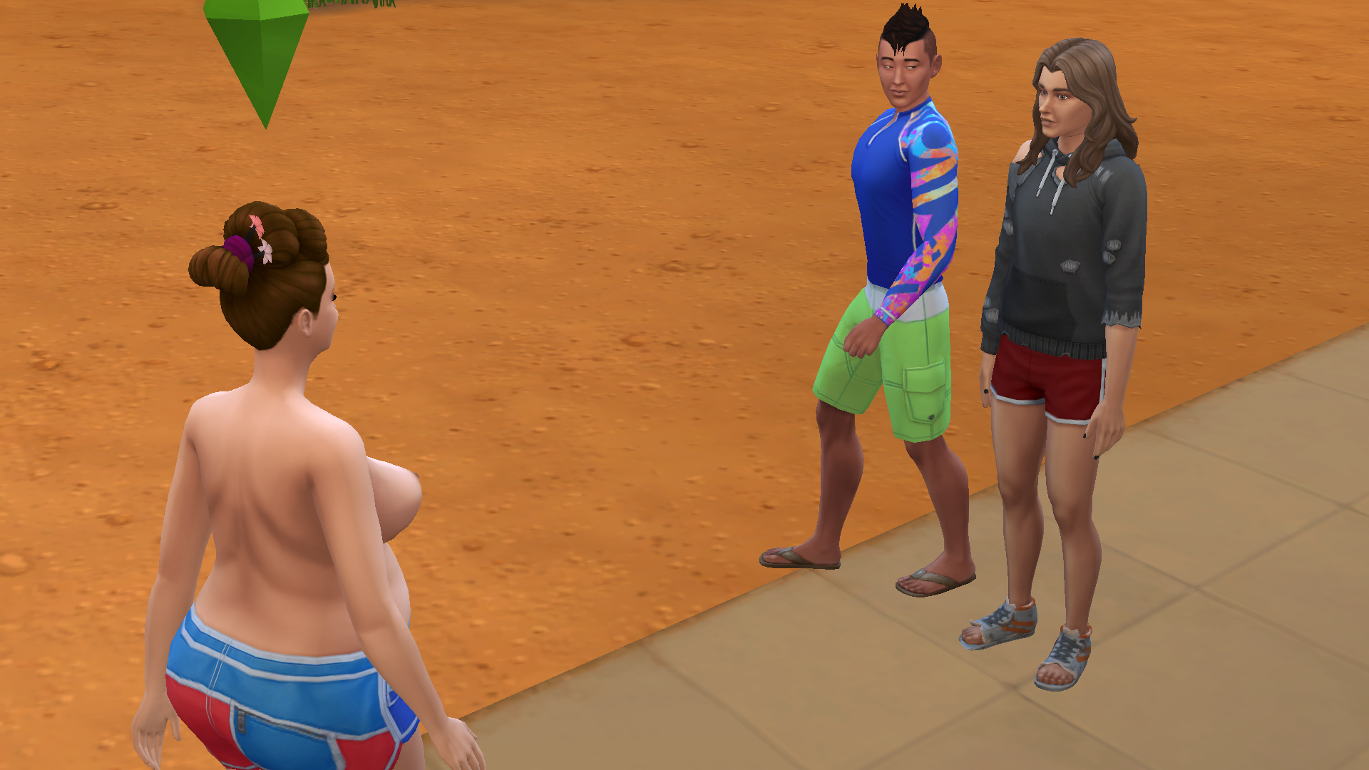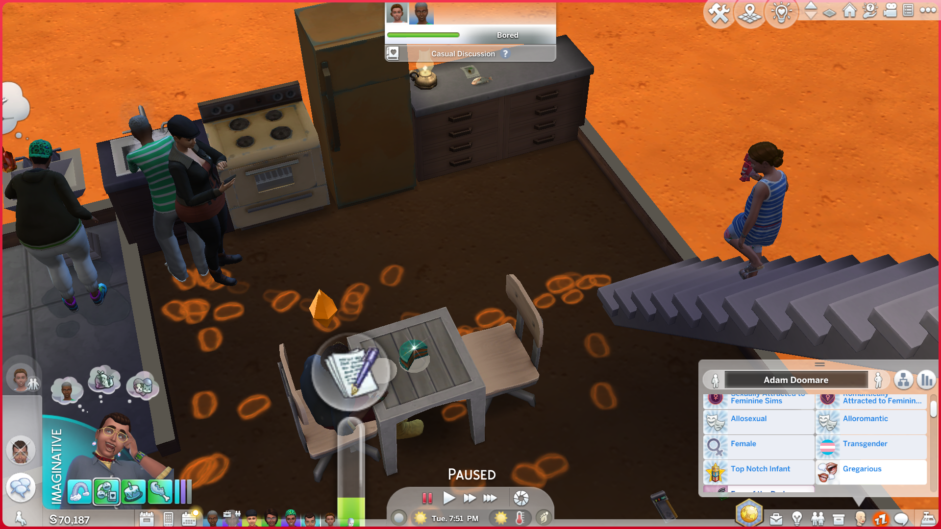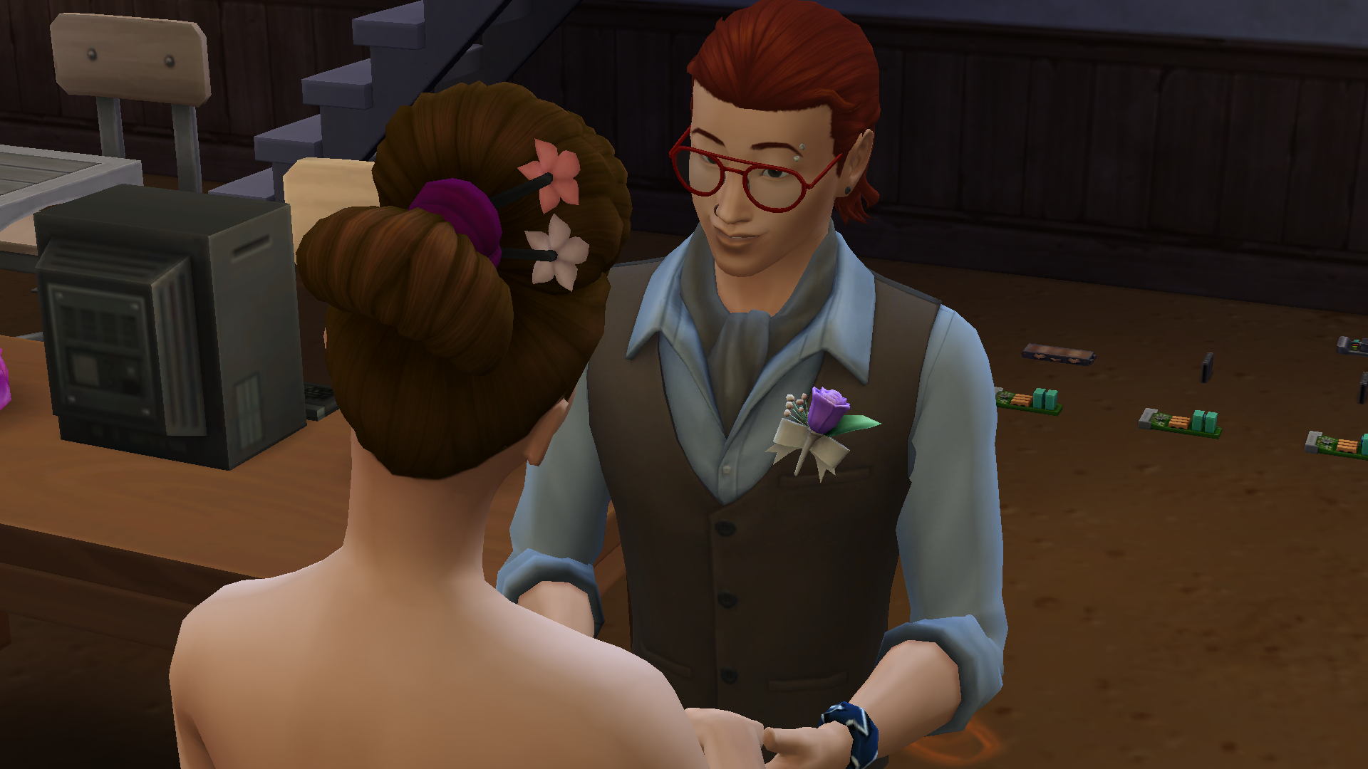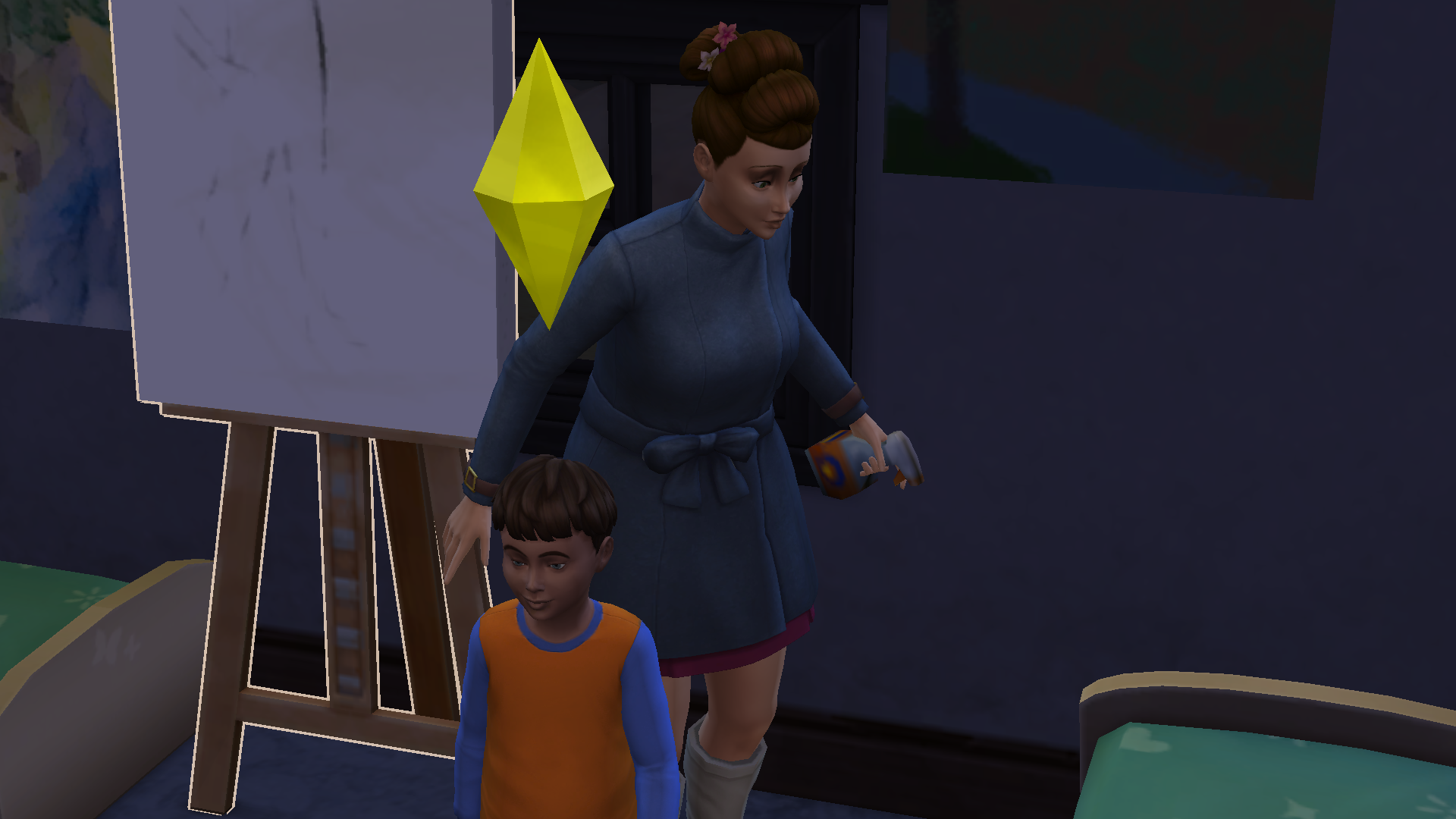 And she grew up with transgender earrings intact. That’s the point at which I went okay, girl, I get the hint. I have a mod that allows you to randomize gender and orientation, or select it yourself, and it’s designed to work with/expand upon EA’s half-assed system. It even has stuff like surgery and voice therapy, but since we haven’t unlocked Journalist yet, I figured we couldn’t go there yet.