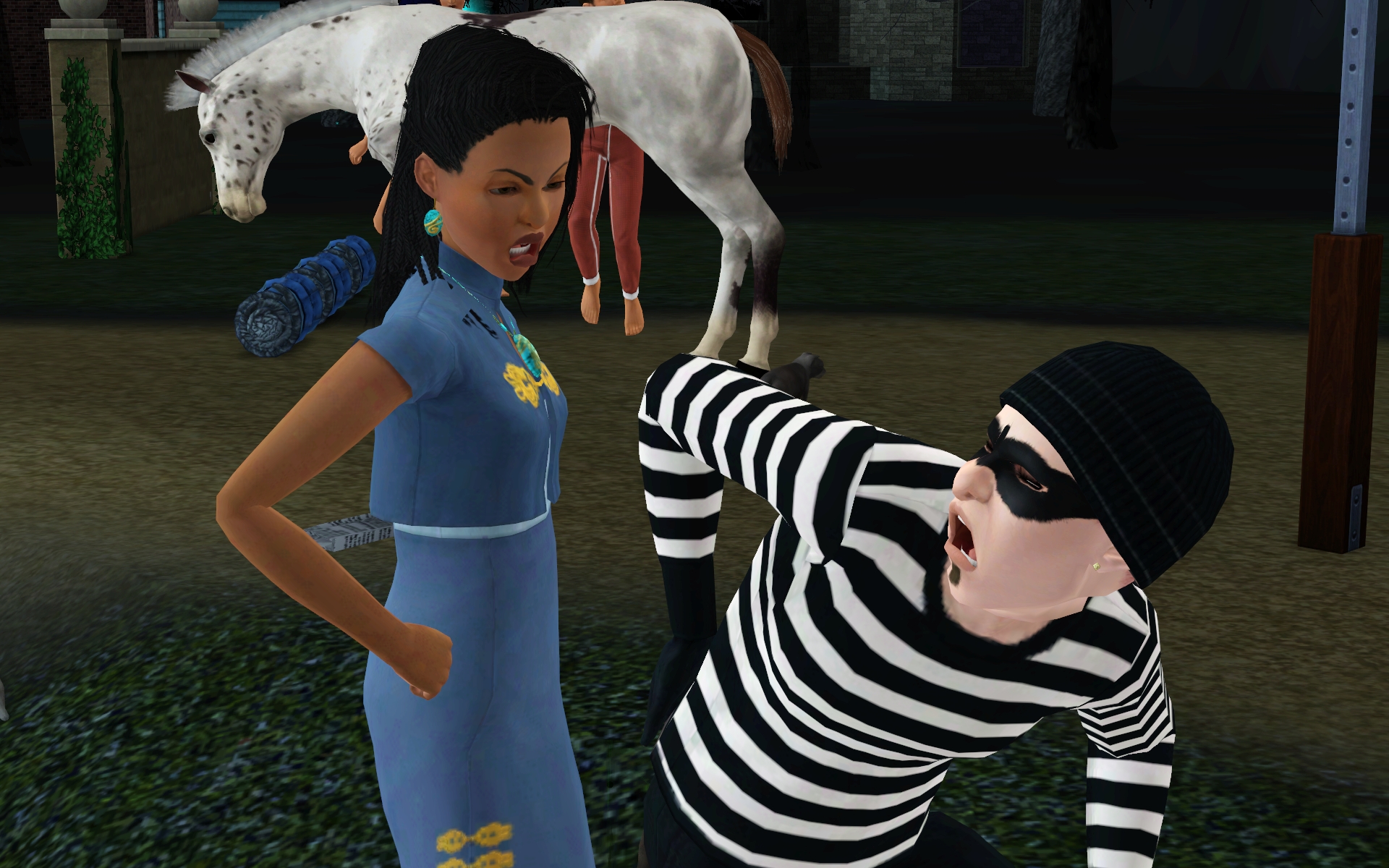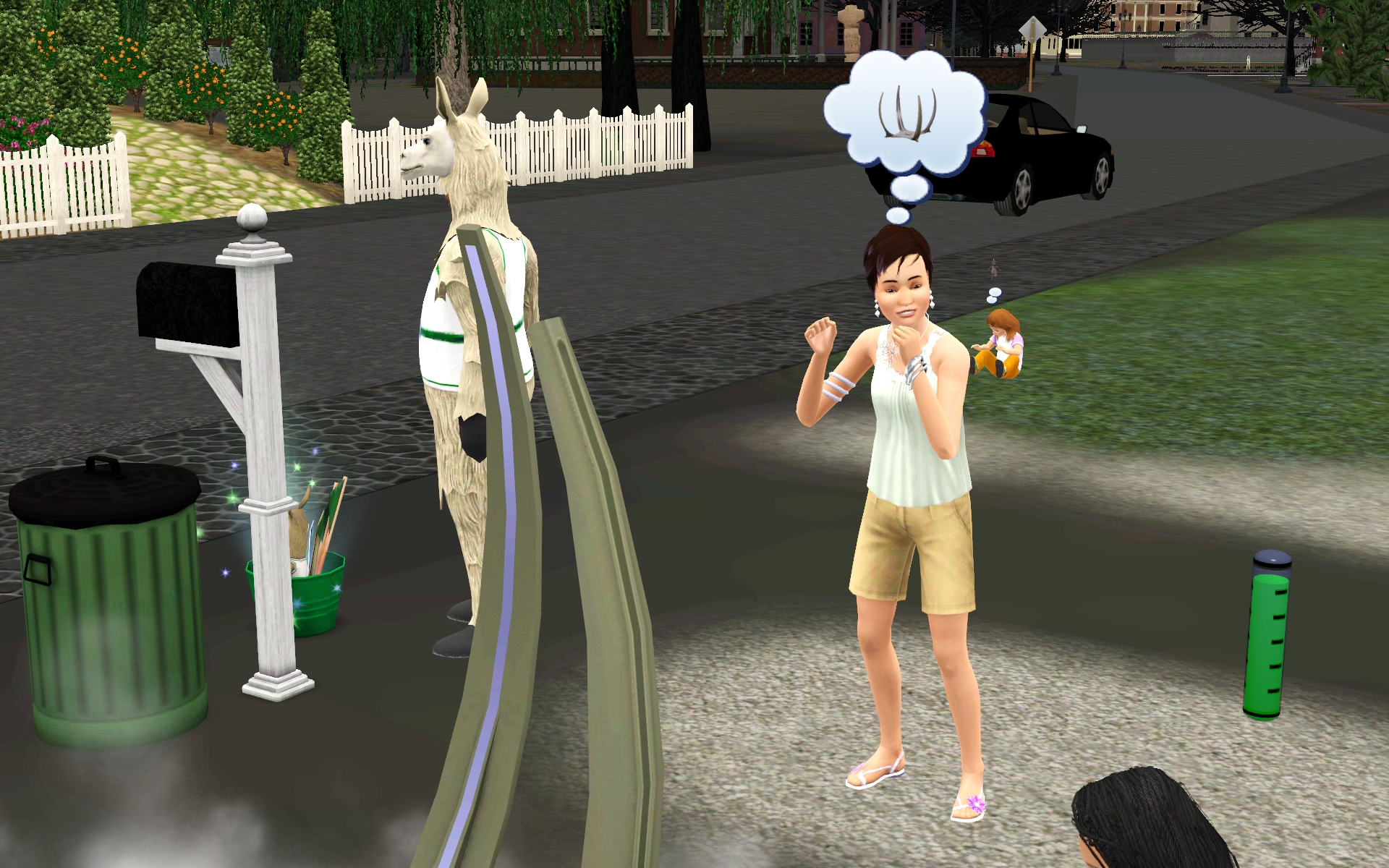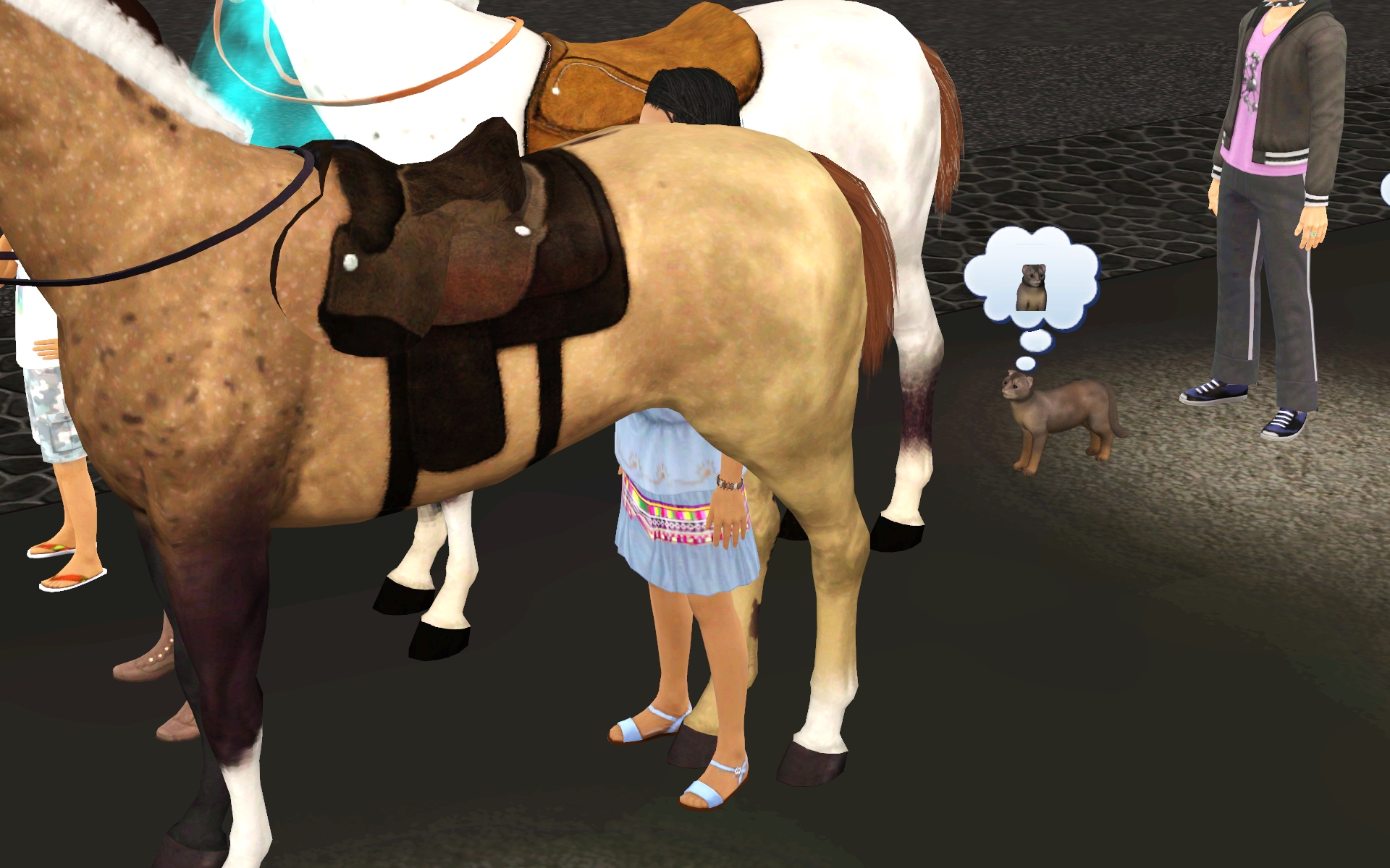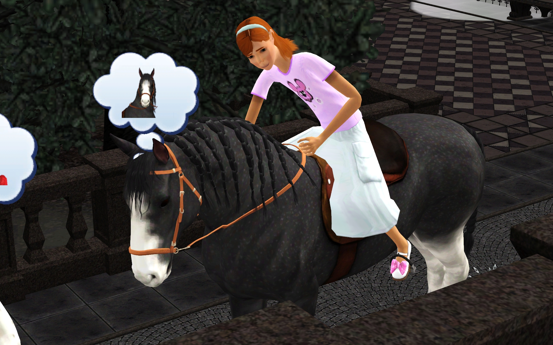 So I have a mod that lets kids ride horses, so I sent Victoria home with Cinnamon. The fact that it deformed VIctoria into Slender Child is a minor detail.