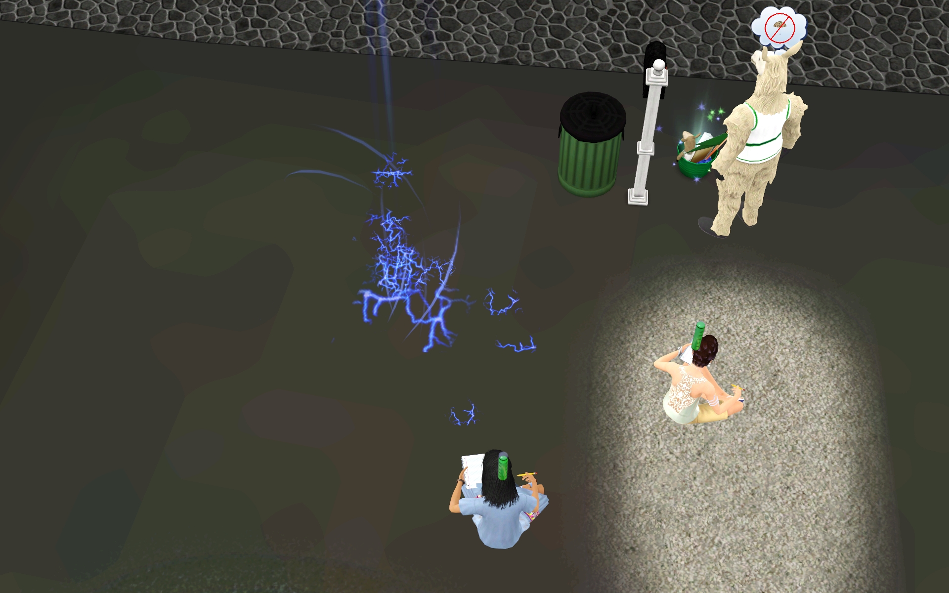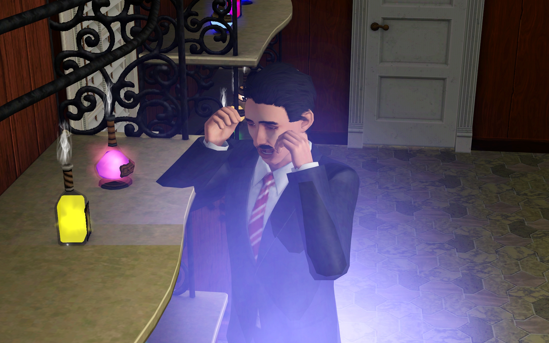 Dan decided to do some work with the sculpting station in the back expansion. Unfortunately my game was glitching up a storm graphic-wise then, and so he actually sculpted black matter.