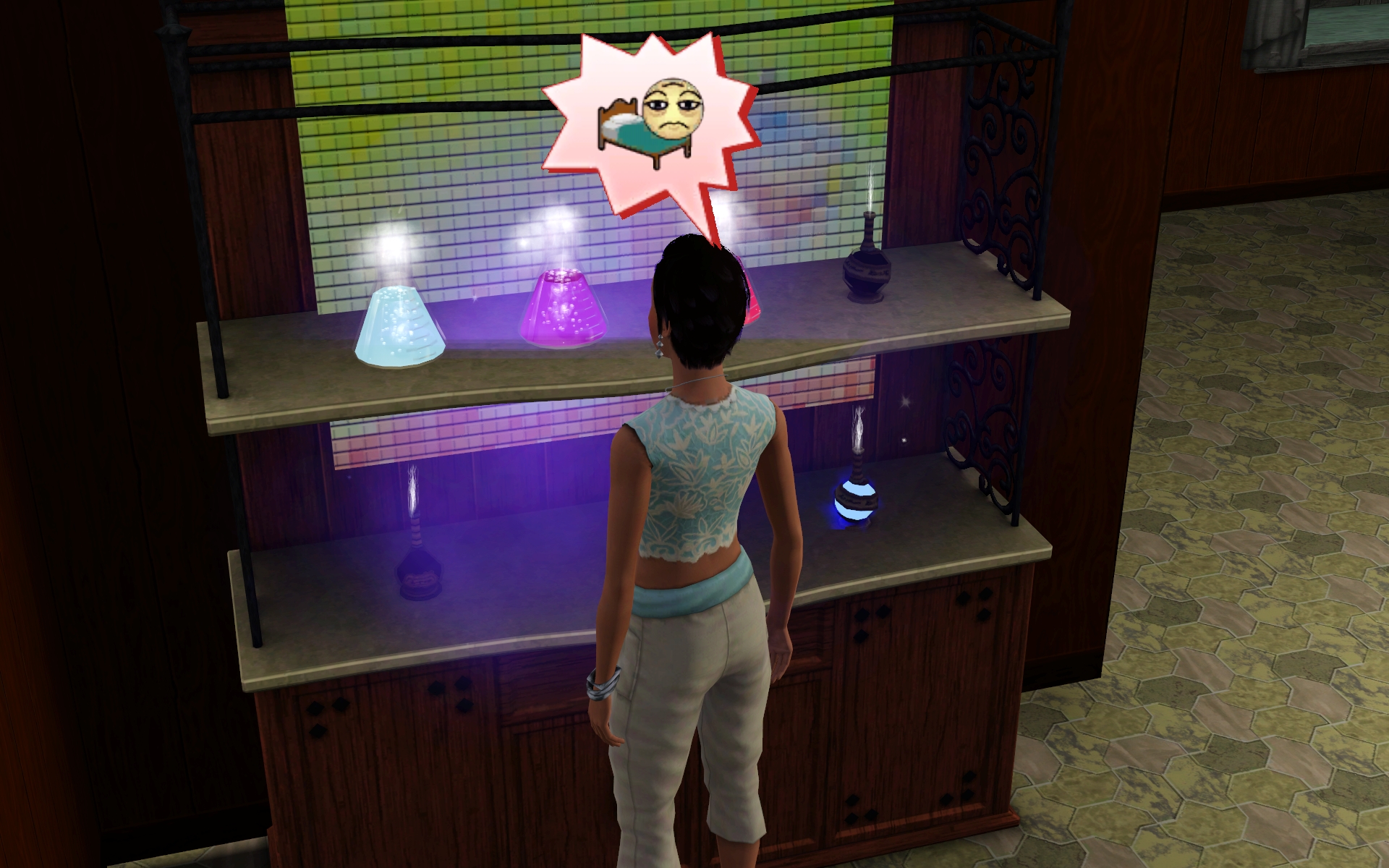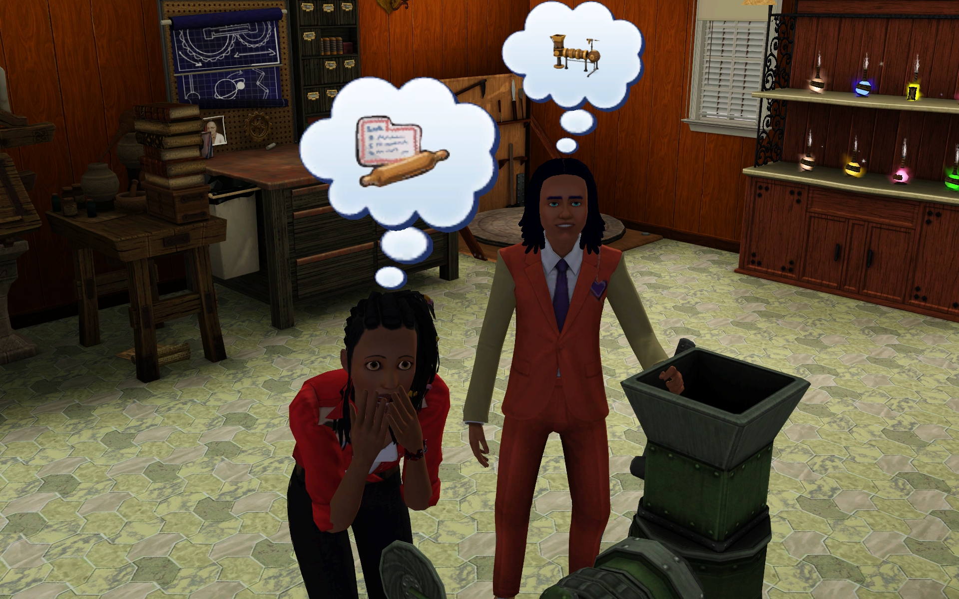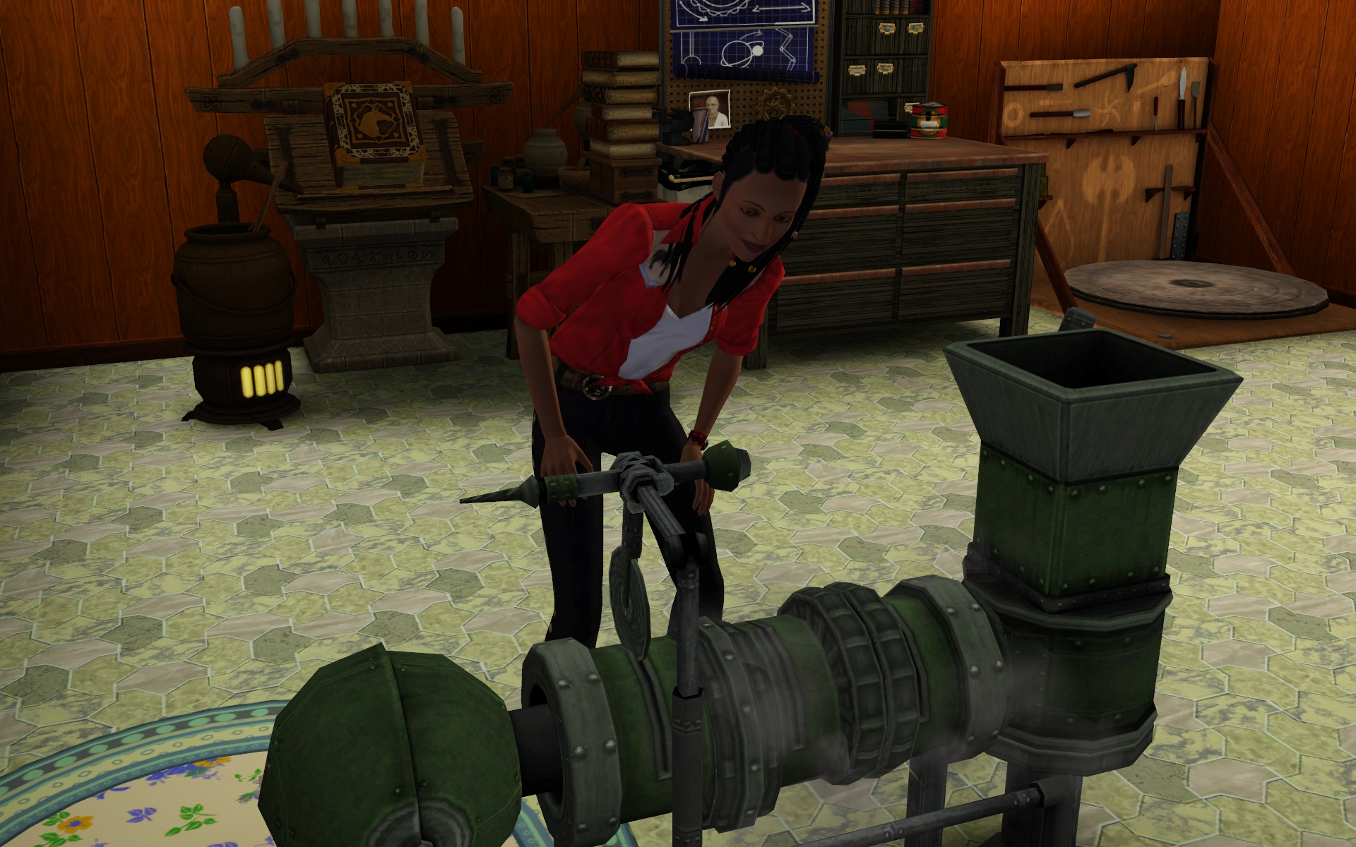 I put all kinds of things in the back area, and added more for this family for their potions and the like. So naturally we tried to wake up the whole neighbourhood with the gem cutter.